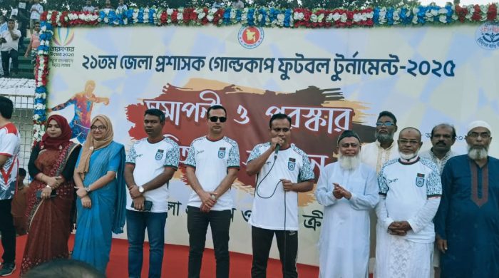 টানটান উত্তেজনা ও জমকালো আয়োজনের মধ্য দিয়ে চাঁদপুরে সম্পন্ন হল চাঁদপুর জেলা প্রশাসক গোল্ডকাপ ফুটবল-২০২৫ এর ফাইনাল ম্যাচ। শনিবর (১৯শে অক্টোবর) চাঁদপুর জেলা স্টেডিয়ামে বিকেল ৩ টায় অনুষ্ঠিত হয় বহুল